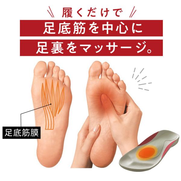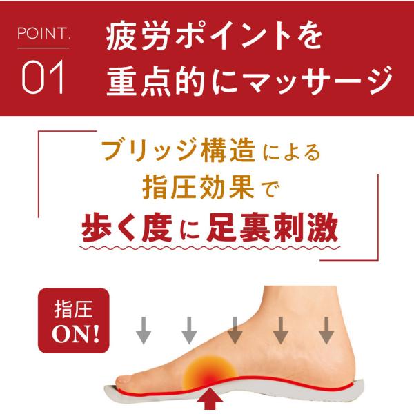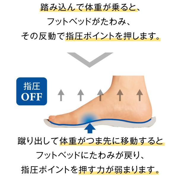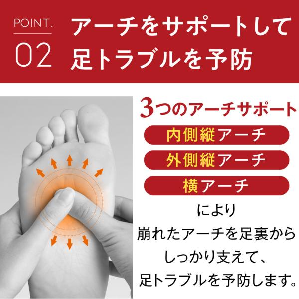 3つのアーチサポート(内側縦アーチ、外側縦アーチ、横アーチ)により、崩れたアーチを足裏からしっかり支えて、足トラブルを予防します。