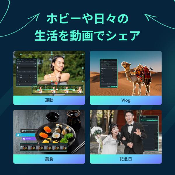 ◆背景削除、AI スマートマスク、AI美顔、AI動画補正、AIボーカルリムーバー、AIテキストベース編集、AI翻訳など豊富な機能が搭載。