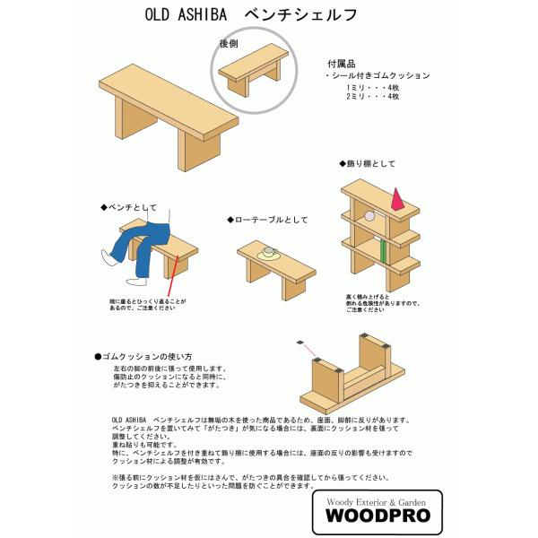 OLD ASHIBA(足場板古材)ベンチシェルフは無垢の木材を使った商品で、材料自体が古材のため、座面、脚部に反りがあります。