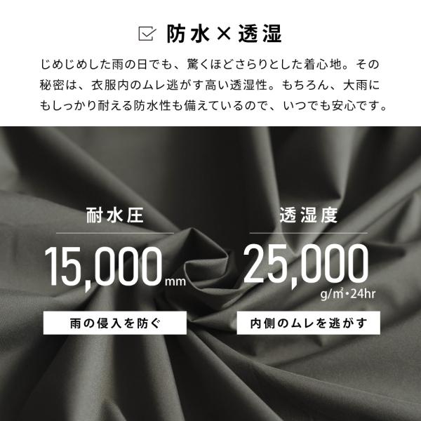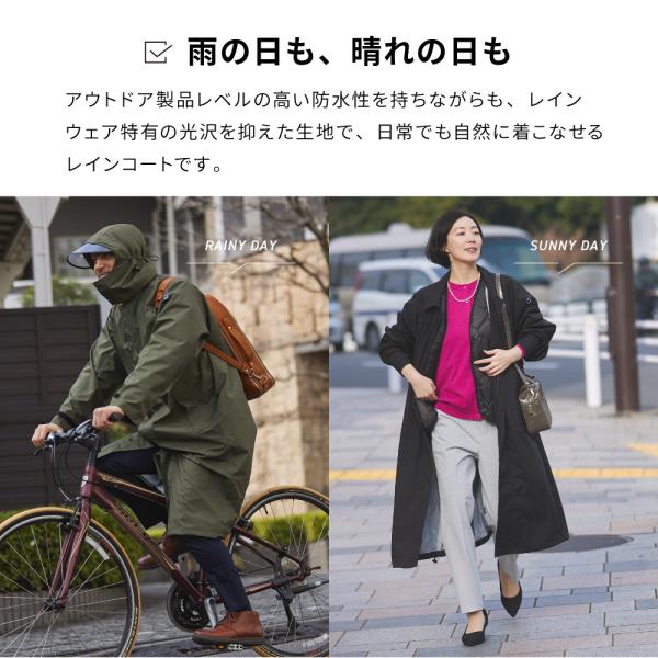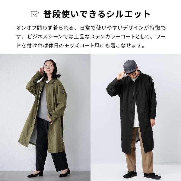 軽くて柔らかな伸縮性のある防水透湿素材を使用したステンカラーがおしゃれなロング丈のレインコートです。肌触りがよくてストレッチが効いた動きやすい着心地の良さ、ベタつかず蒸れにくい快適さ、晴れの日に街で映える上質なデザインを追求した、きちんと雨具なのに季節を問わず毎日着てしまう魅力と実力を備えたレインコート。使用素材は大雨にも耐えられる耐水圧15,000mmの防水素材で、さらに透湿度25,000gと外からの雨を防ぎながら同時に衣服内の湿気(水蒸気)を外へ排出する「防水透湿生地」なので、汗など衣服内の蒸れを軽減して衣服内はいつも快適。伸縮性があり動作もスムーズ。フードは独自開発の回転式フードを採用し、自転車運転時の左右確認を安全・快適にします。フード部分は取り外し可能で、普段はステンカラーコートとしてご使用いただけます。クリアな視界を提供する着脱式レインバイザートップ1枚が標準で付いています。バイザートップもスッポリ入る持ち運びに便利な収納袋が付属。メンズ、レディースどちらも素敵に着こなして頂けるユニセックスデザインでビジネスシーンにもオススメ。通勤や通学にオールシーズンご着用頂けます。爆買