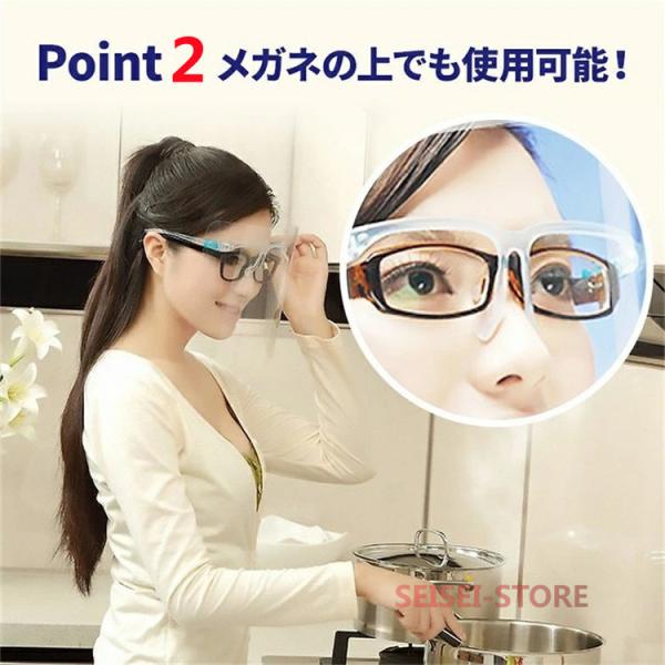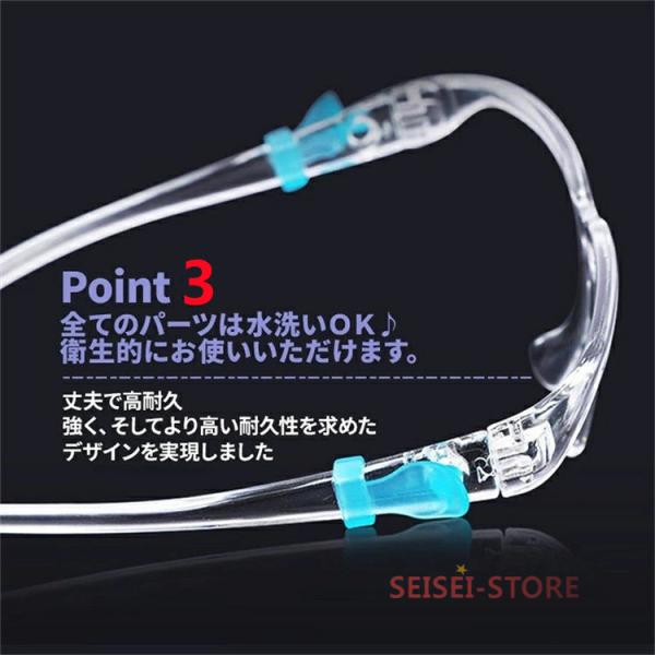 完全に透明なデザイン、クリアな可視レンズ、広い視野。 保護カバー構造は顔全体を保護することができ、設置と操作が非常に簡単で便利です。遮光面と顔の間に程良い空間があるので、近視眼鏡を装着しても邪魔をしない。