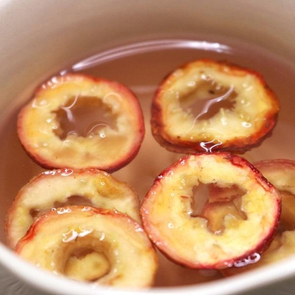 ・5gのさんざし(6片ぐらい)をさっと水洗いしてから80度〜のお湯を150ml注ぎそのまま5分待てば飲みごろのサンザシティーに。