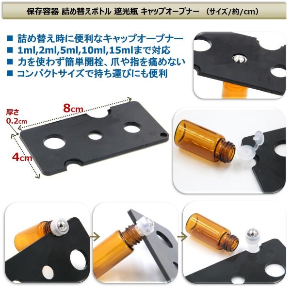 小分け瓶の中栓は付属の専用オープナーを利用して綺麗に外れるので詰め替えも簡単。きっちり密閉できるボトルキャップで液漏れや液だれを防ぎ、遮光効果の高い“茶色“ボトルで紫外線からの品質劣化を抑えます。