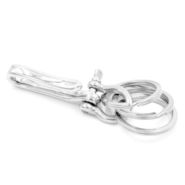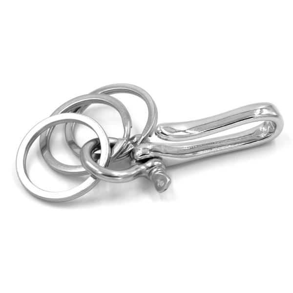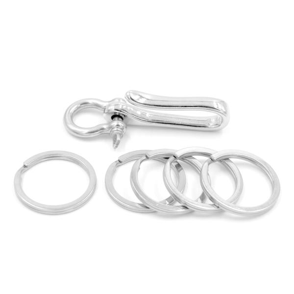 釣り針フックとキーリングをつなぐU字シャックルはネジ開閉タイプで着脱自在。付属の平押し二重リング・キーリングを加えてキーホルダー機能を高めたり、真鍮製パーツをジョイントすればヴィンテージ感漂う仕様に。