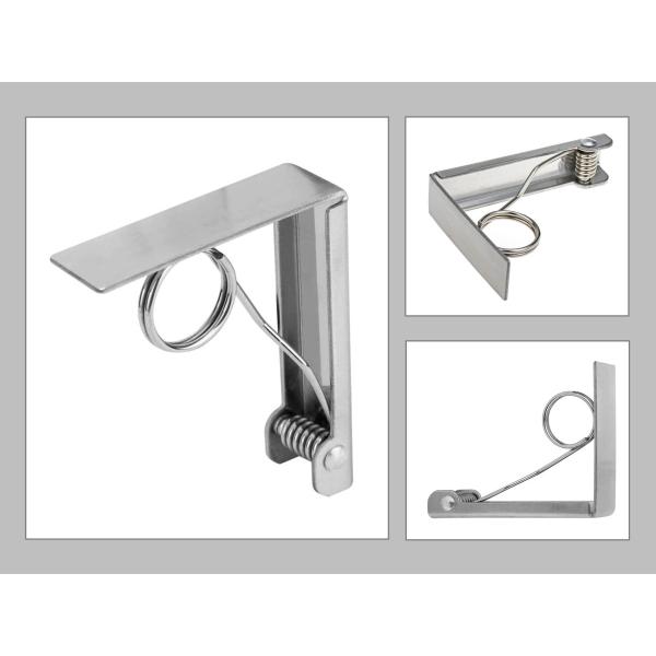 キックバネやねじりコイルばねを接合し、“しなり”と“返し”の力を相乗して強いグリップ力を生み出す仕組み。テーブルクロスを5.5センチ厚までのテーブル板にしっかり固定するデザインと実用性を兼ね併せた使い易い設計。