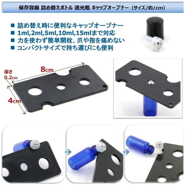 小分け瓶の中栓は付属の専用オープナーを利用して綺麗に外れるので詰め替えも簡単。きっちり密閉できるボトルキャップで液漏れや液だれを防ぎ、遮光効果の高い“藍色“ボトルで紫外線からの品質劣化を抑えます。