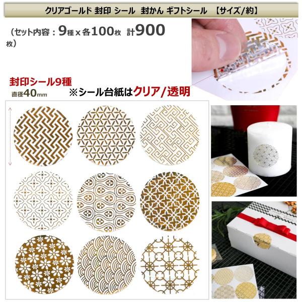 透明 ゴールド 封印 封かん シール 模様 ギフトシール 招待状 案内状 ラベル ステッカー クリアゴールド(9種 900枚)