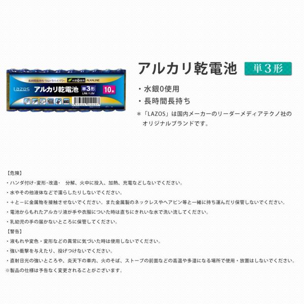 単3 アルカリ乾電池 Lazos 60本(60本入り1箱) 単三 長時間 長持ち 送料無 la-t3-6