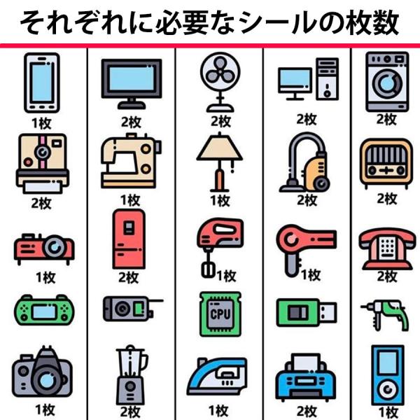 パソコン、テレビ、スマートフォン、電子レンジ、冷蔵庫、ドライヤー、ゲーム機、掃除機、アイロン、カメラなどに
