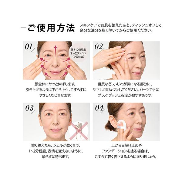 (2)1プッシュを全顔に。手早く、薄く塗り広げます。顔を引き上げるように下から上へ、こすらずにやさしくなじませます。