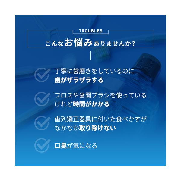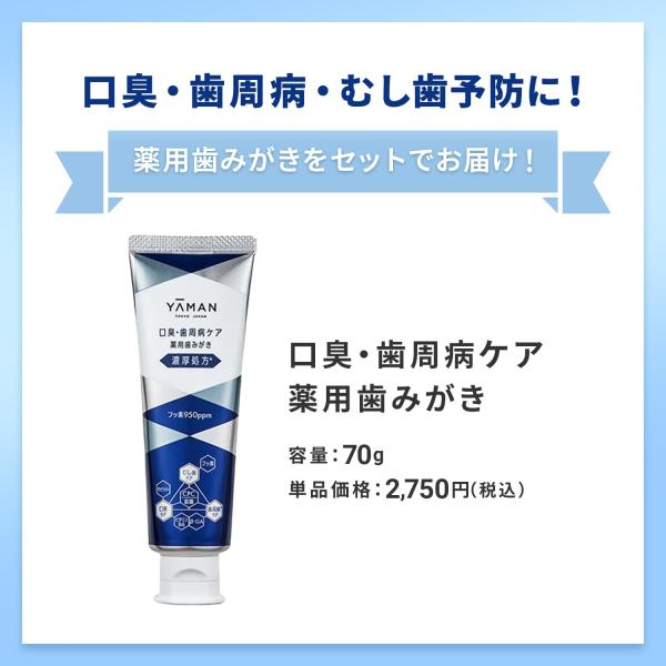 本体、口臭・歯周病ケア薬用歯みがき、充電用USBケーブル、ACアダプター、ジェットノズル×1本、ソフト回転ノズル×1本、収納ポーチ、取扱説明書(保証書付)
