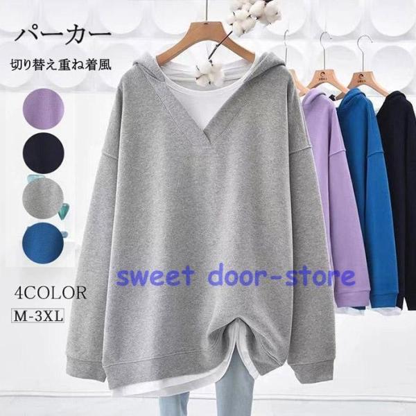 パーカー レディース オーバーサイズ 春秋コーデ 薄手 スウェット トレーナー フェイクインナー ゆったり 着痩せ 秋服 暖かい アウター 秋冬 オシャレ 大