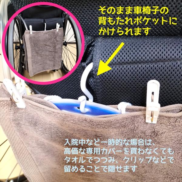 車椅子の場合は、背もたれポケットに掛けられます。