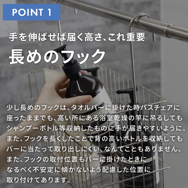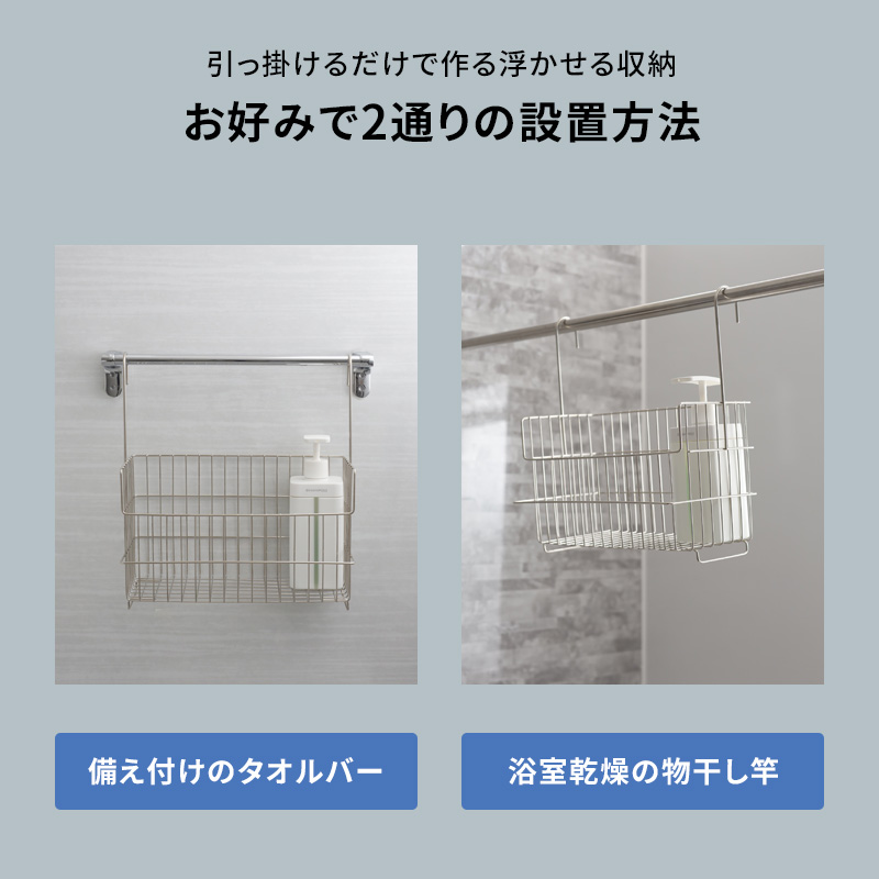 浴室に備え付けのタオルバーや浴室乾燥機の物干し竿に引っ掛けて使える収納アイテムです。