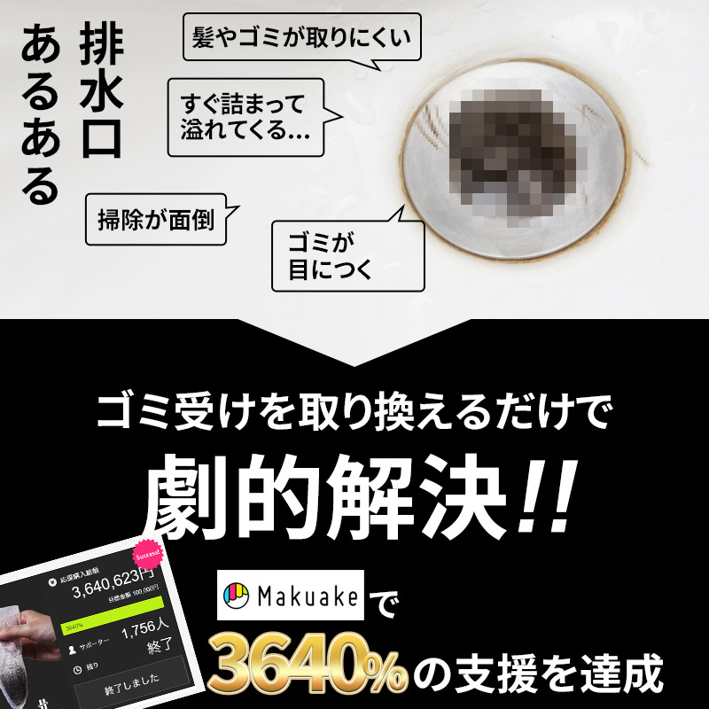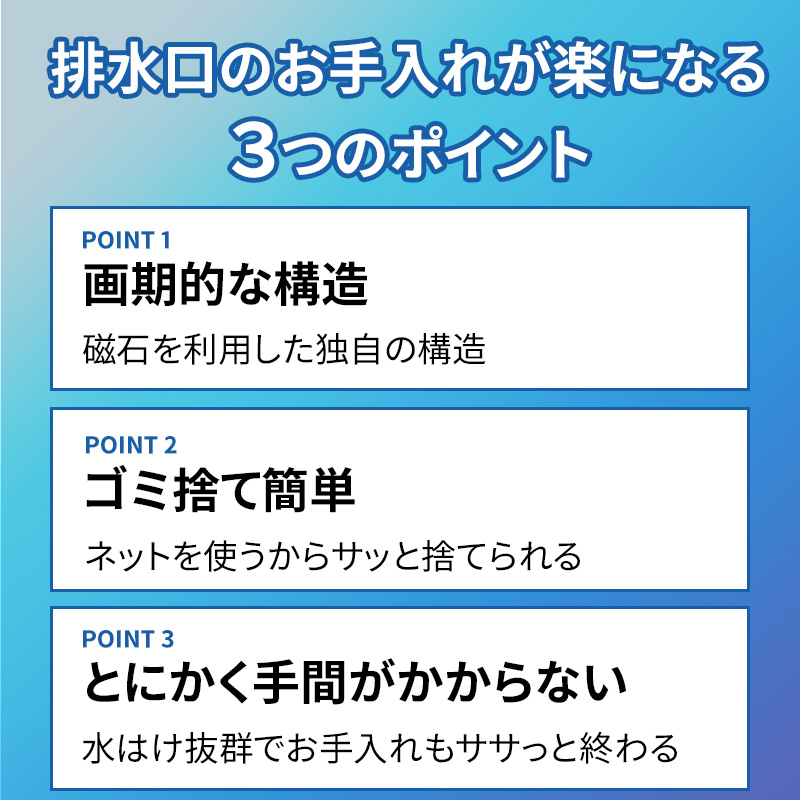 金属フレームとマグネットの間に排水口ネットをセットする今までにない特殊な構造で驚きの排水性とストレスフリーなゴミ捨てを実現した排水口グッズ。