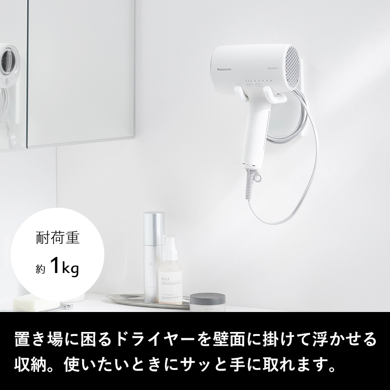 石こうボード壁に取り付けられるドライヤーホルダー。洗面台やドレッサーの横など手に取りやすい場所に簡単に設置できます。