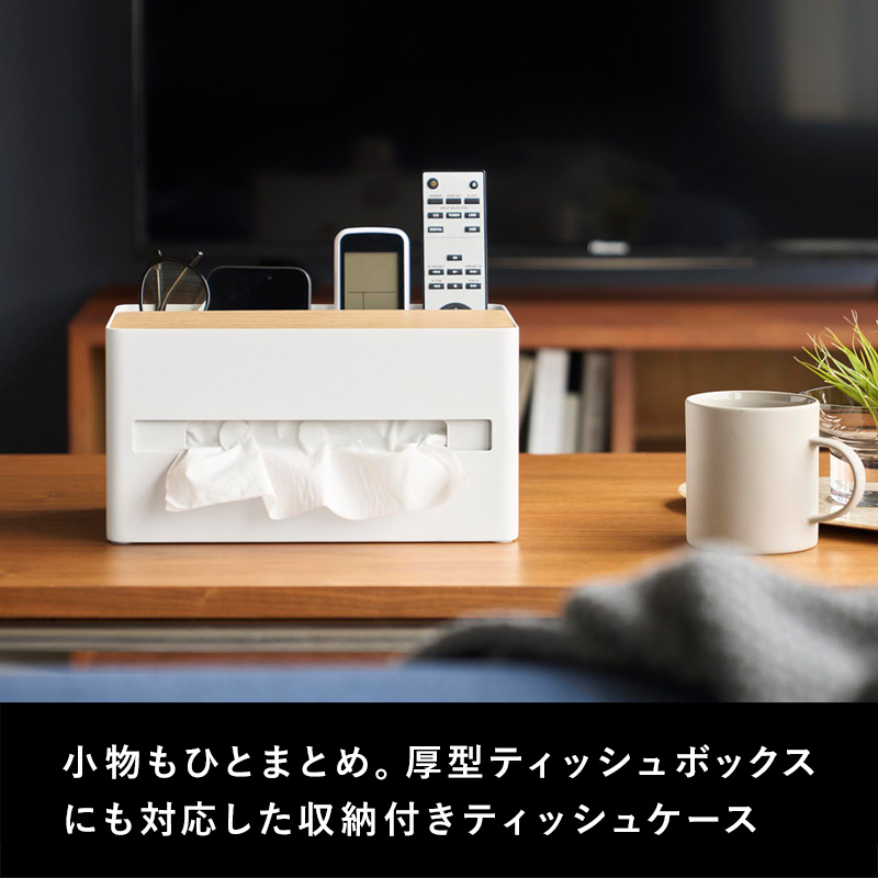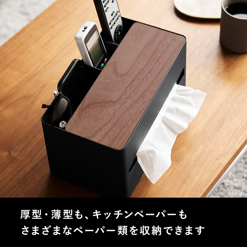 木製の蓋がアクセントに。ティッシュケースとリモコンホルダーが一体になった、おしゃれな多機能ティッシュケース。