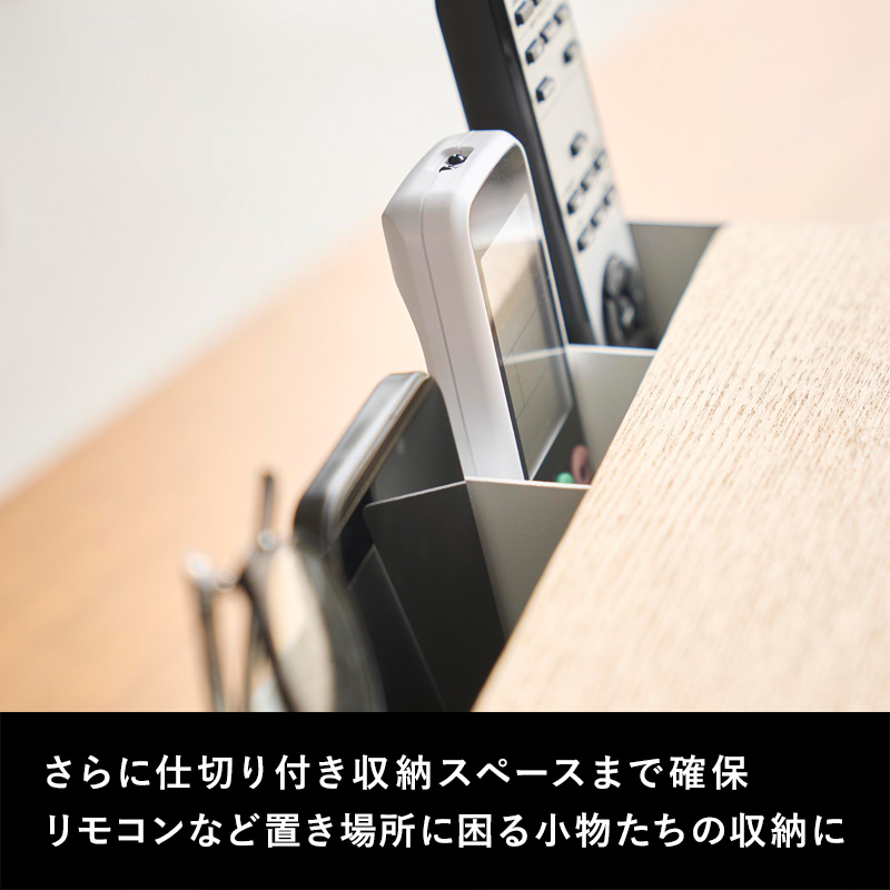 小物が収納できるスペースは便利な仕切り付き。仕切りは可動式なので、リモコンなど収納するものに合わせて調節可能に。