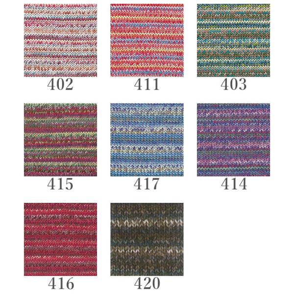 質の良いウールモヘヤの糸を7色の段染めにし、2本を撚った多色ミックスの段染め糸。