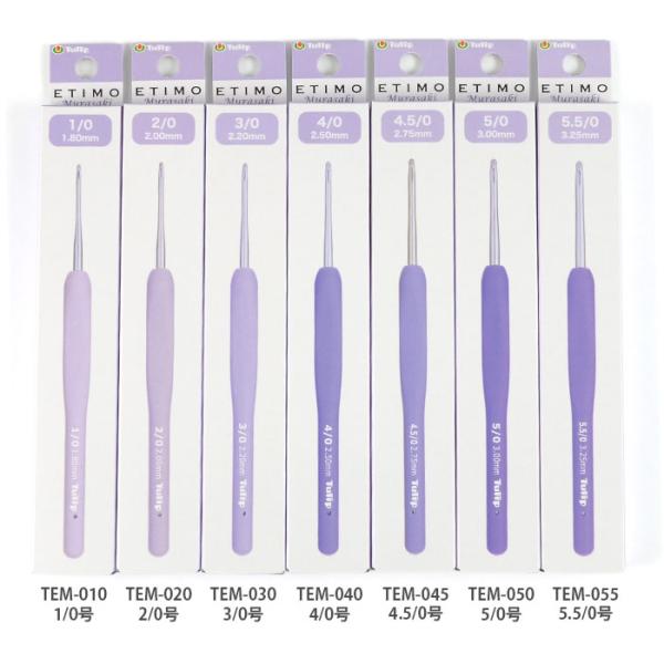 かぎ先は艶のある淡い紫色、クッショングリップは号数によって少しずつ色味が変化しているため、並べるときれいなグラデーションになります。