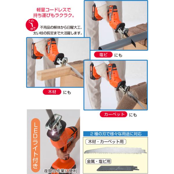 【セット内容】本体、木材・絨毯用ノコ刃、金属プラスチック用ノコ刃、ACアダプター、バッテリー、収納ケース