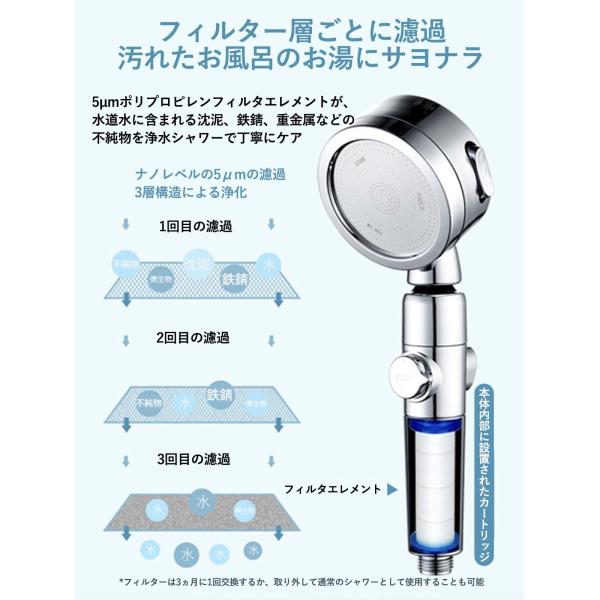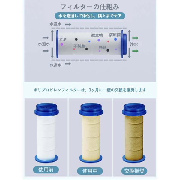 フィルターは3層になっていて、ろ過し不純物を除去、とてもきれいなお水でシャワーが出来ます。