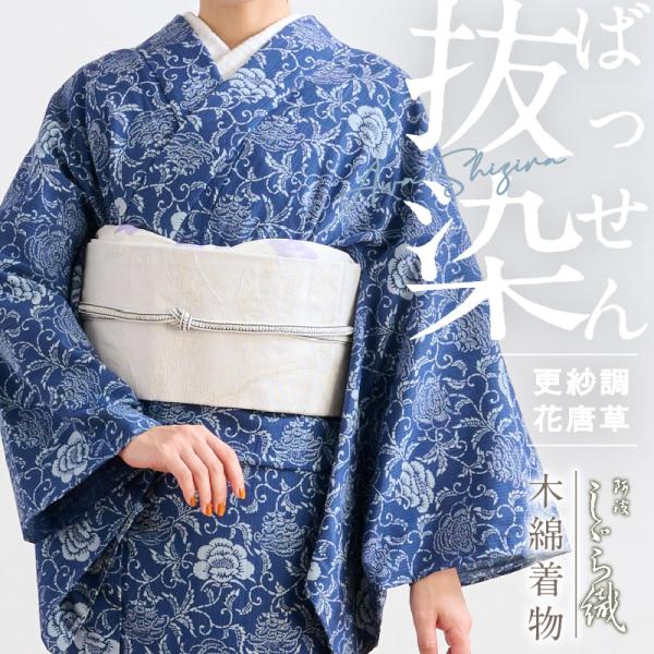 洗える着物 阿波しじら お仕立て代込み 抜染 更紗調花唐草 No.542 12m しじら織 夏着物 防抜染 単衣着物 木綿 フルオーダー 湯通し済み 浴衣 家庭洗濯可