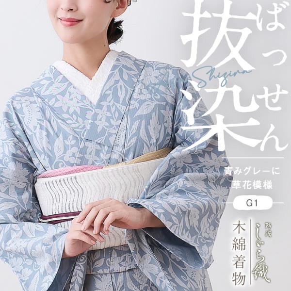 洗える着物 阿波しじら 『お仕立て代込み』 抜染 【青みグレーに草花模様 】 12m しじら織 単衣着物 木綿 フルオーダー 浴衣 家庭洗濯可 No.G01 レディ―ス
