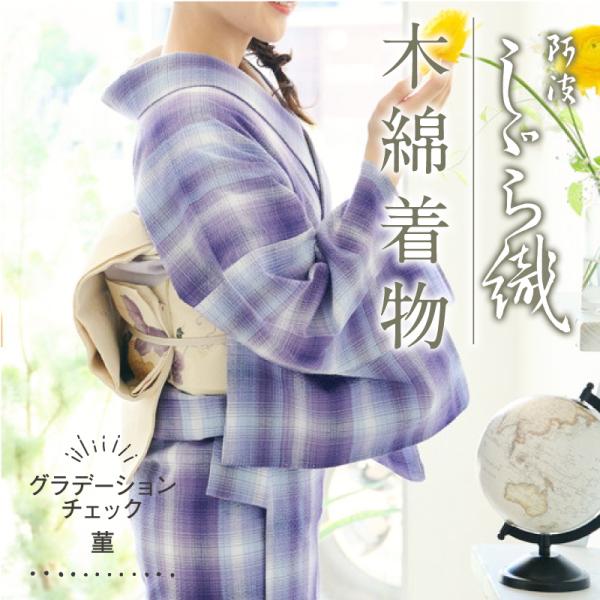 洗える着物 阿波しじら《お仕立て代込み》グラデーションチェック 菫 D8 紫 チェック パープル 13m しじら織 夏着物 ゆかた 木綿 普段着 湯通し済み 和装 日本製