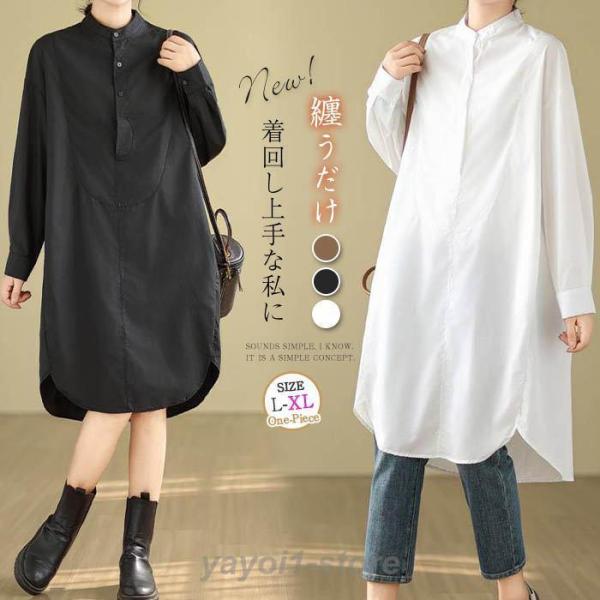 シャツワンピース レディース チュニックワンピース バンドカラー シャツ ワンピース 春 秋 大きいサイズ 長袖 白シャツ 重ね着 レイヤード チュニック プルオー