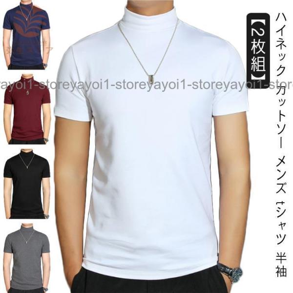 【2枚組】 ハイネック カットソー メンズ tシャツ 半袖 半袖Tシャツ ゆったり 無地tシャツ 襟高さ4-5cm ハイネックtシャツ