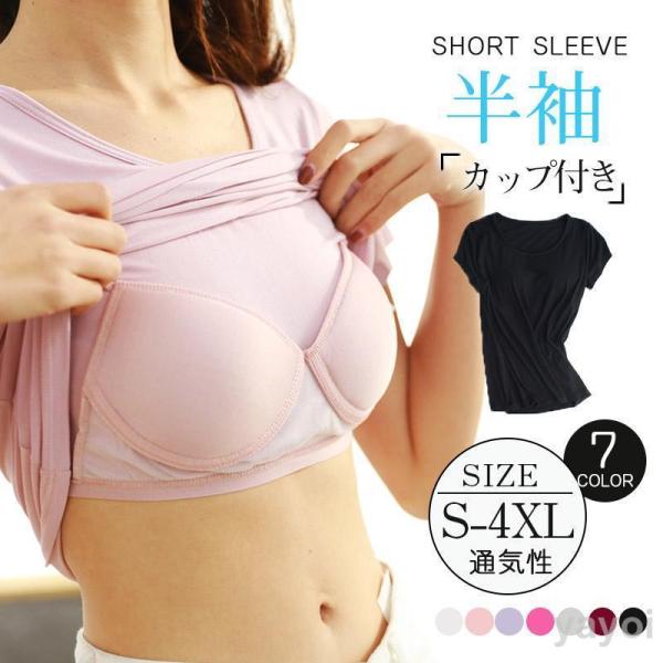 tシャツ 半袖tシャツ インナー カップ付き ヨガ 薄手 ブラトップ 接触冷感 カットソー ベーシック シンプル 無地 クルーネック インナー