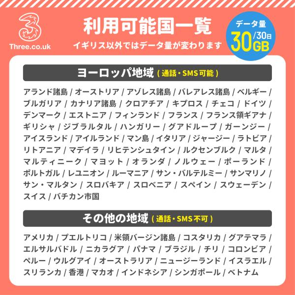 イギリス UK SIM THREE ヨーロッパ周遊 eSIM 30日間/無制限 プリペイド SIM 音声通話 SMS 電話番号付き ドイツ イタリア フランス スイス スペイン マルタ 他