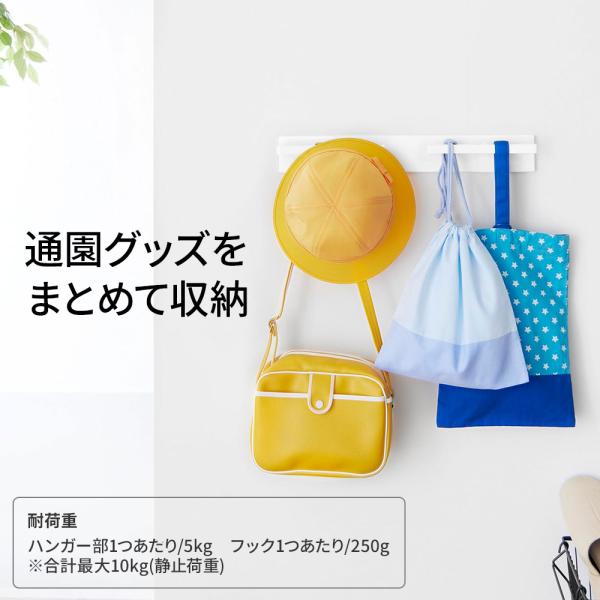 耐荷重(約):10kg(ハンガー部1つあたり/5kg フック1つあたり/250g ※但し、合計最大10kgまで)(静止荷重)
