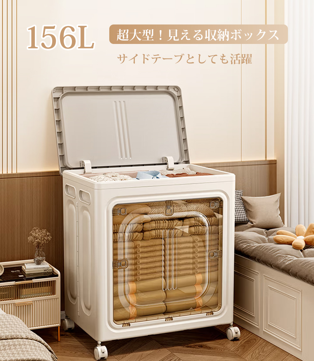 約156Lの大容量で、衣類や布団、おもちゃなど、かさばる物の収納に最適です。保育園、子供部屋、寝室、バスルーム、ユーティリティルーム、クローゼットに適しています。