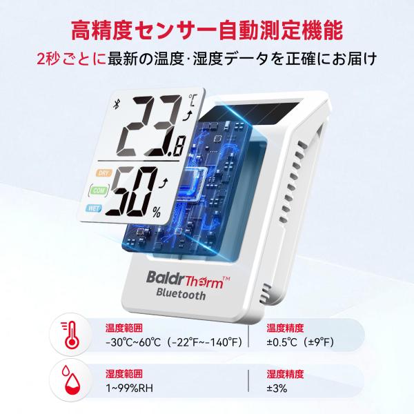 BaldrTherm デジタル温湿度計 Bluetooth温湿度計 ソーラー温湿度計 省エネ スマート家電 湿度計 温度計 アプリ遠隔操作 快適度顔表示付 高精度 大文字 熱中症