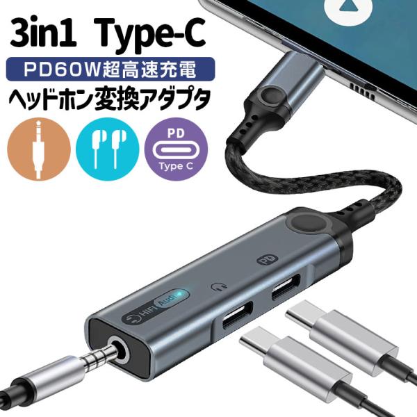 3in1 TypeC 変換ケーブル 3.5mmイヤホン PD 60W 急速充電 USB-C イヤホン 変換アダプタ通話・音楽・音量調節可能 3ポート 充電とイヤホンが同時