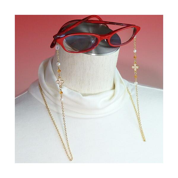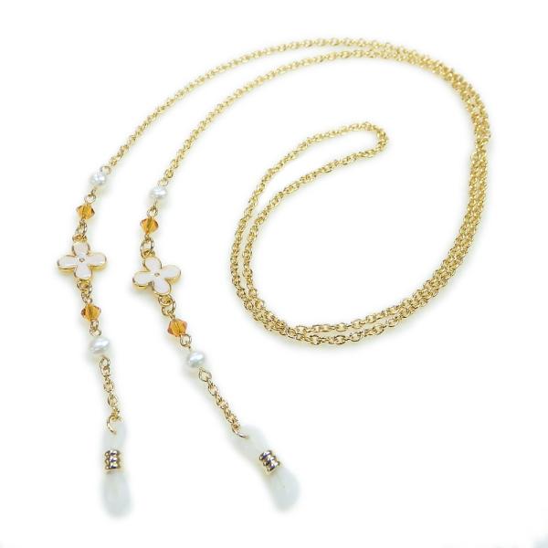 メール便 メガネチェーン ホワイトフラワー & オレンジ スワロフスキー & パール 眼鏡チェーン グラスコード めがねチェーン マスクチェーン 爆買