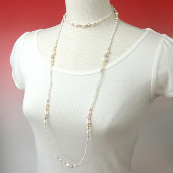 ロングネックレス 淡水パール 淡水真珠 スリーカラー 真珠 120cm 超ロング ギフト マルチカラー ホワイト オレンジ パープル 母の日 ギフトに プレゼントに