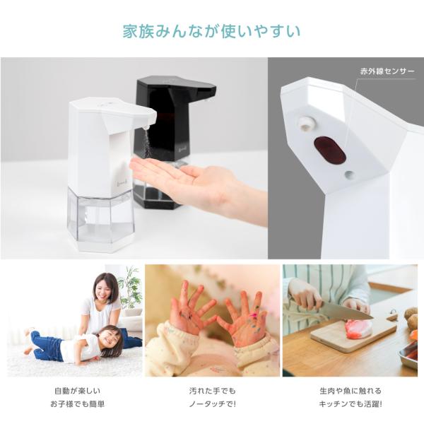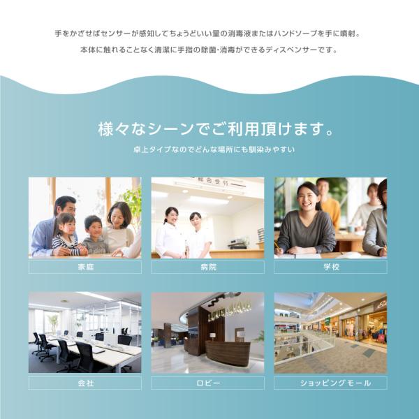 自動的に消毒液をスプレーします、細菌や汚れが残らずに有効に風邪や細菌の伝染を防げます,汚れた手でポンプに直接触る必要がなく、衛生的で交差汚染のリスクを避けます。