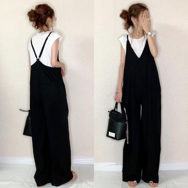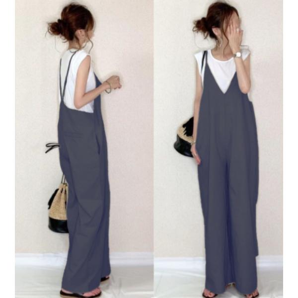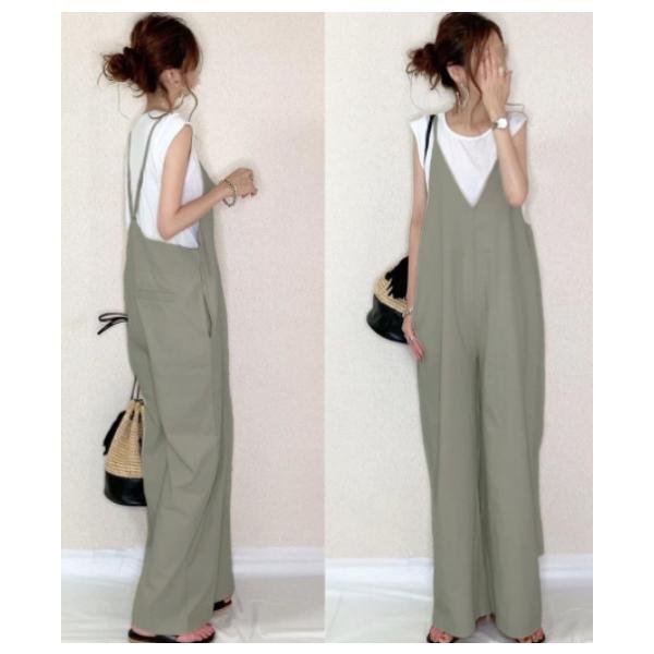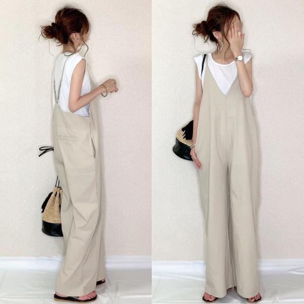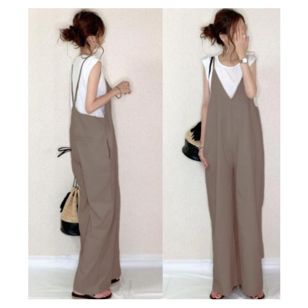 サロペット パンツ レディース 春 夏 秋 オールインワン Vネック 無地 シンプル マタニティ ワイドパンツ キャミソール 体型カバー ゆったり ズボン ロングパンツ ロング丈 パンツ