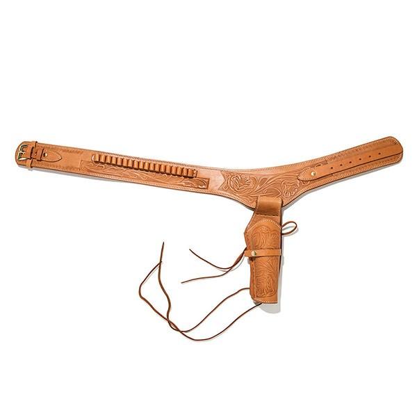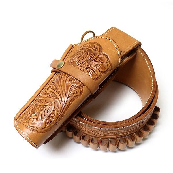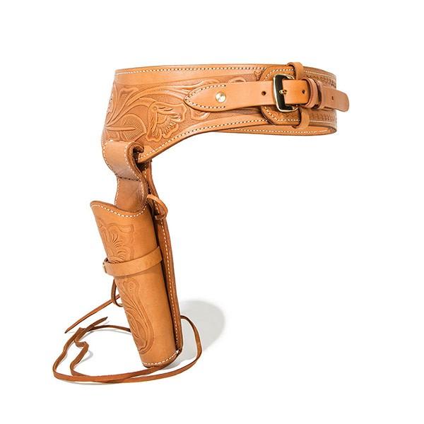 カーヴィングが施された、本革を使用したガンベルトです。革部分は、グラデーションのないマットなモノカラータイプになります。