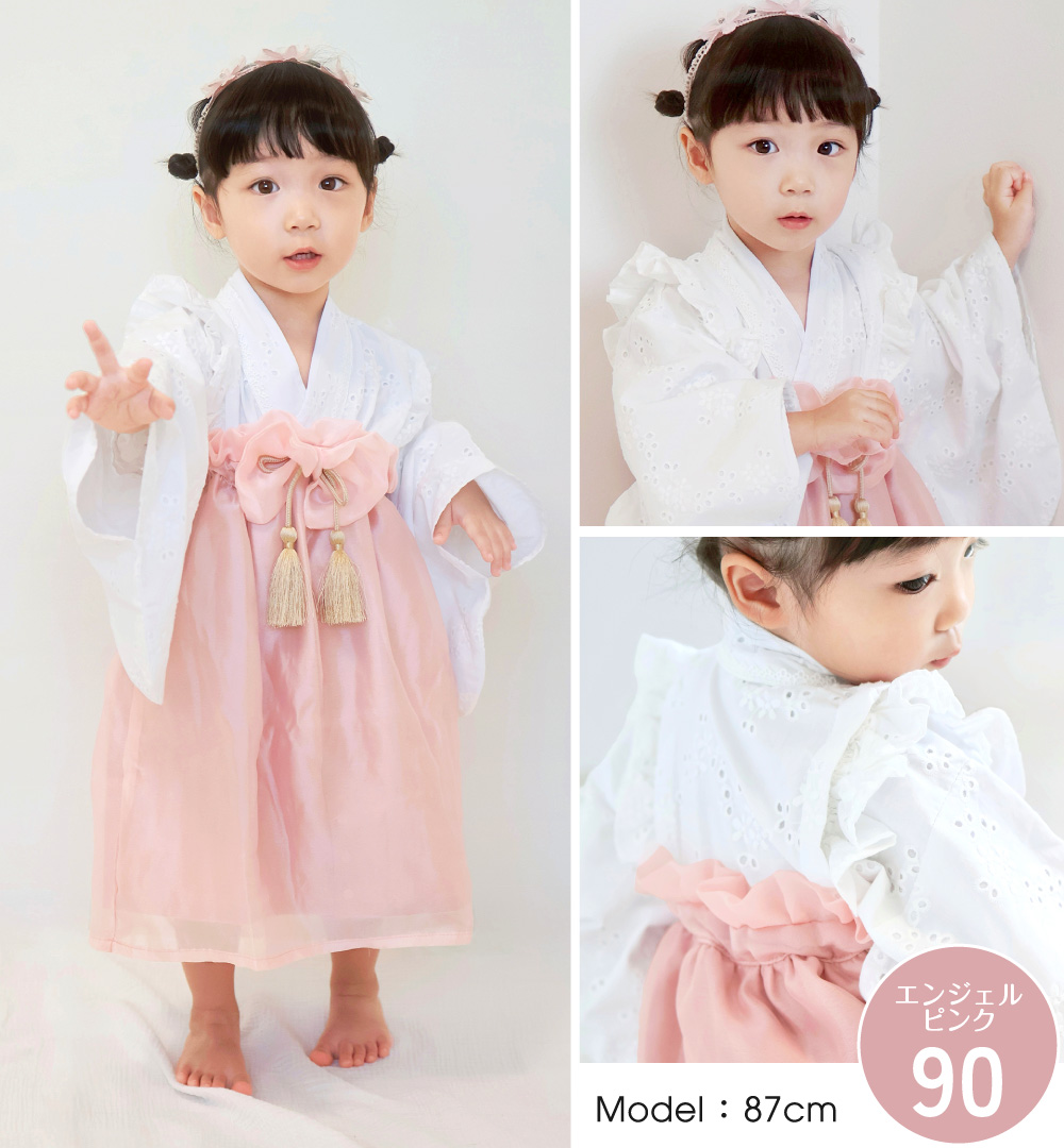 regalo piuオリジナルベビー袴「恋音(れのん)2ピース」は、ベビー・キッズの可愛らしさを最大限に引き出す、とっておきの一着。お肌に優しいコットン100%のアイレットレースの上衣に、袴部分には上品な輝きのオーガンジー生地、肌側には綿ちりめん生地を使用しました。