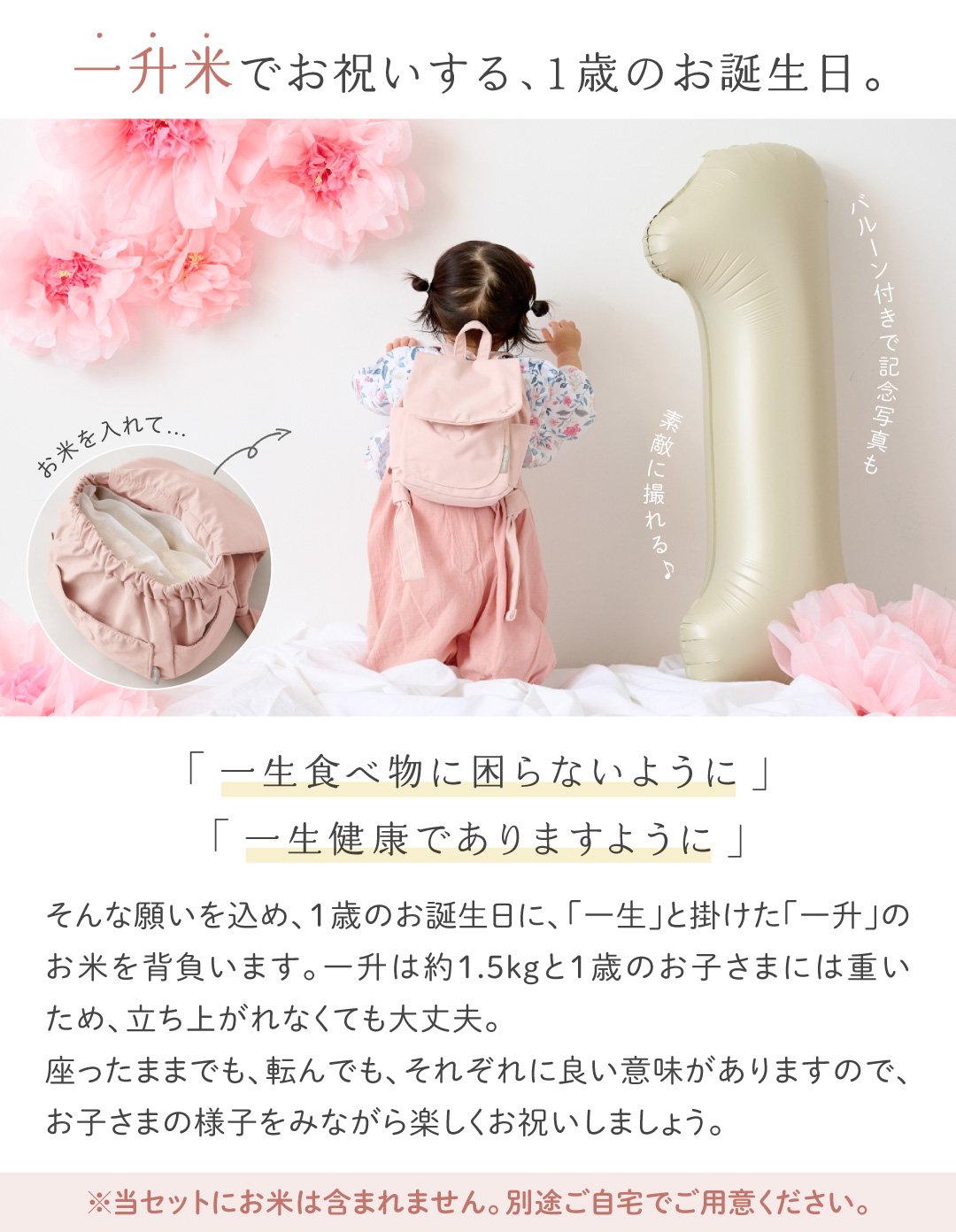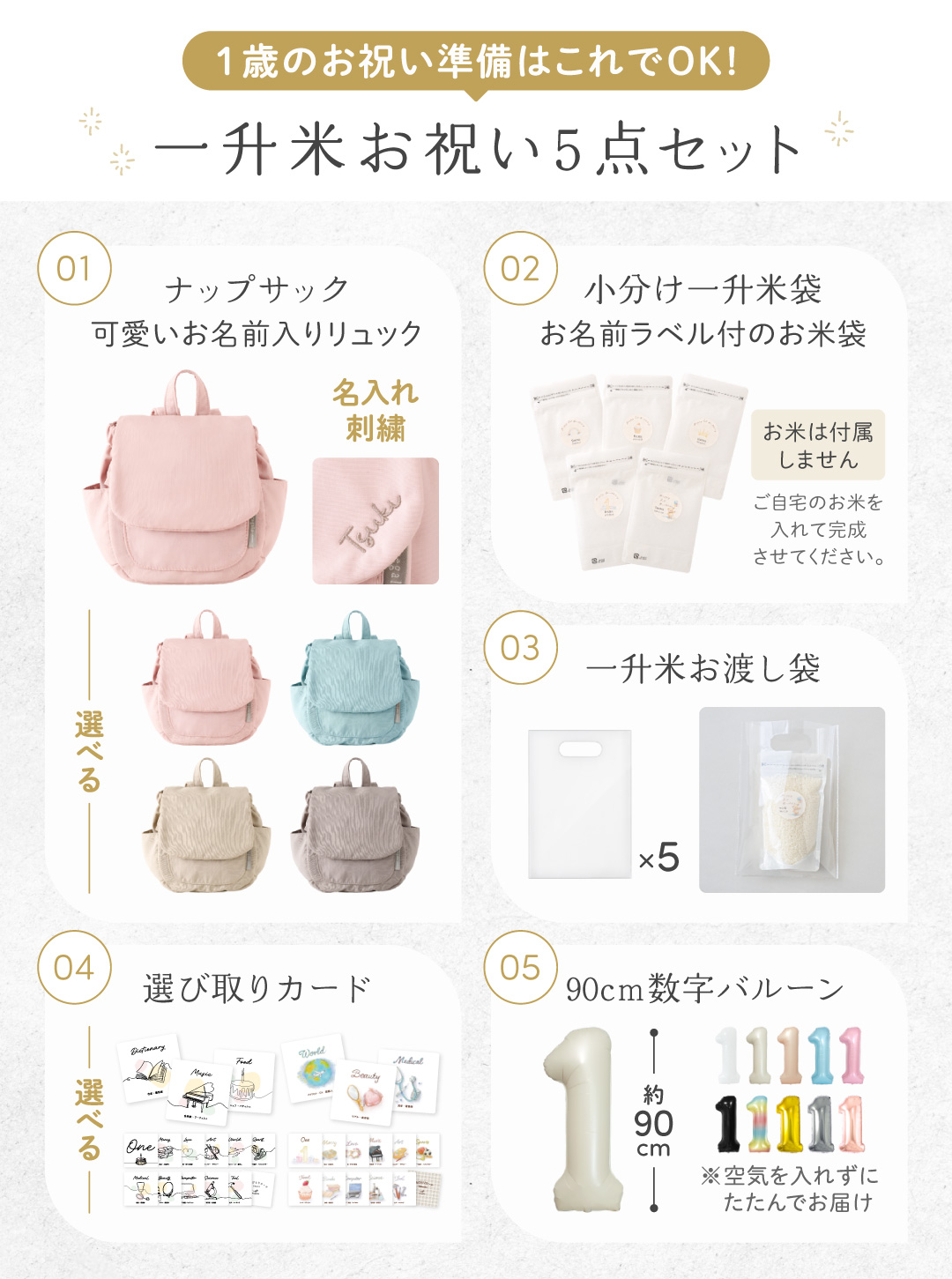 【お米なし】 ベビー リュック 5点セット 一升米袋 1歳 誕生日 小分け 選び取り 名前入り 男の子 女の子 プレゼント 一升米お祝いセット rv000 regalo