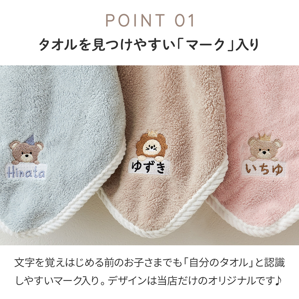 保育園・幼稚園グッズとして人気の「お名前刺繍」入りループタオル。文字を覚えはじめる前のお子さまでも「自分のタオル」と認識しやすい、当店オリジナルのマーク入りです。
