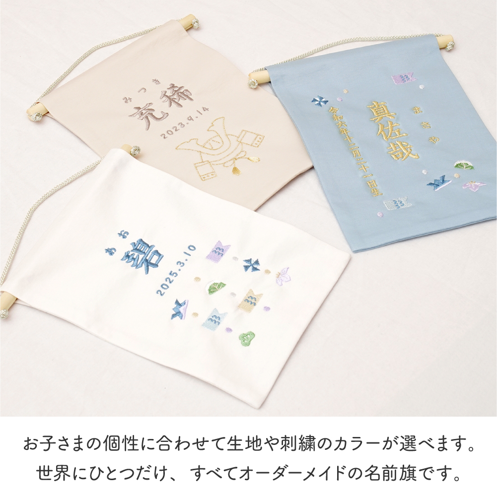 4種類のデザインから選べる名前旗。お子様の個性や好みに合わせて生地のカラーと刺繍カラーが選べます。お節句の飾りやお誕生日祝いに人気の名前旗は、出産祝いや初節句のギフトにもおすすめです。