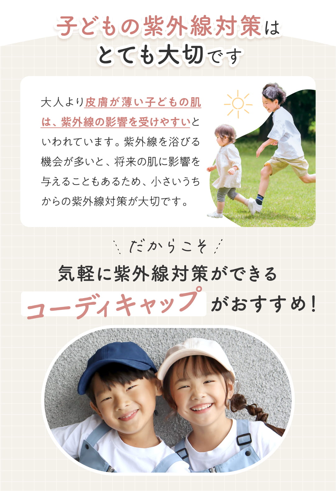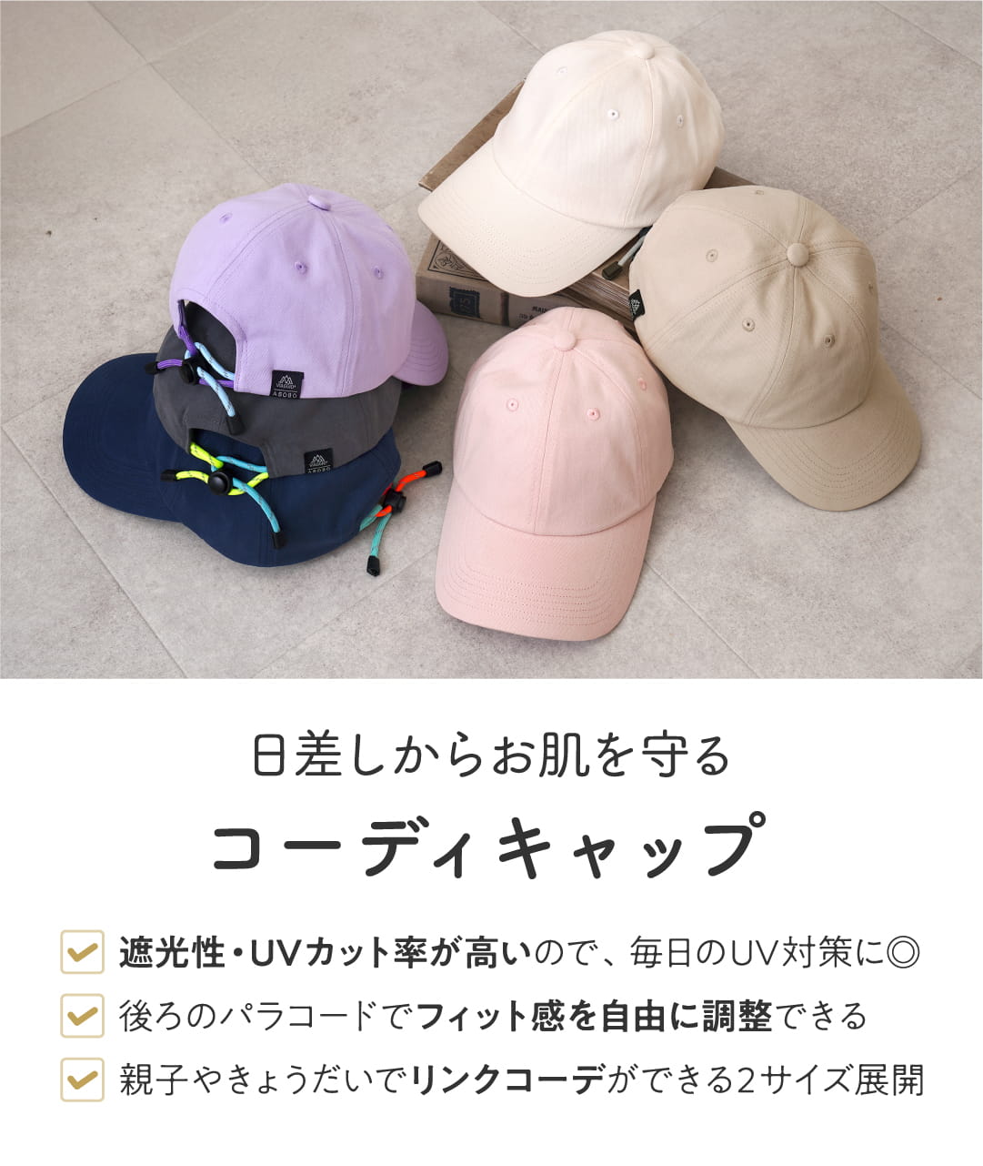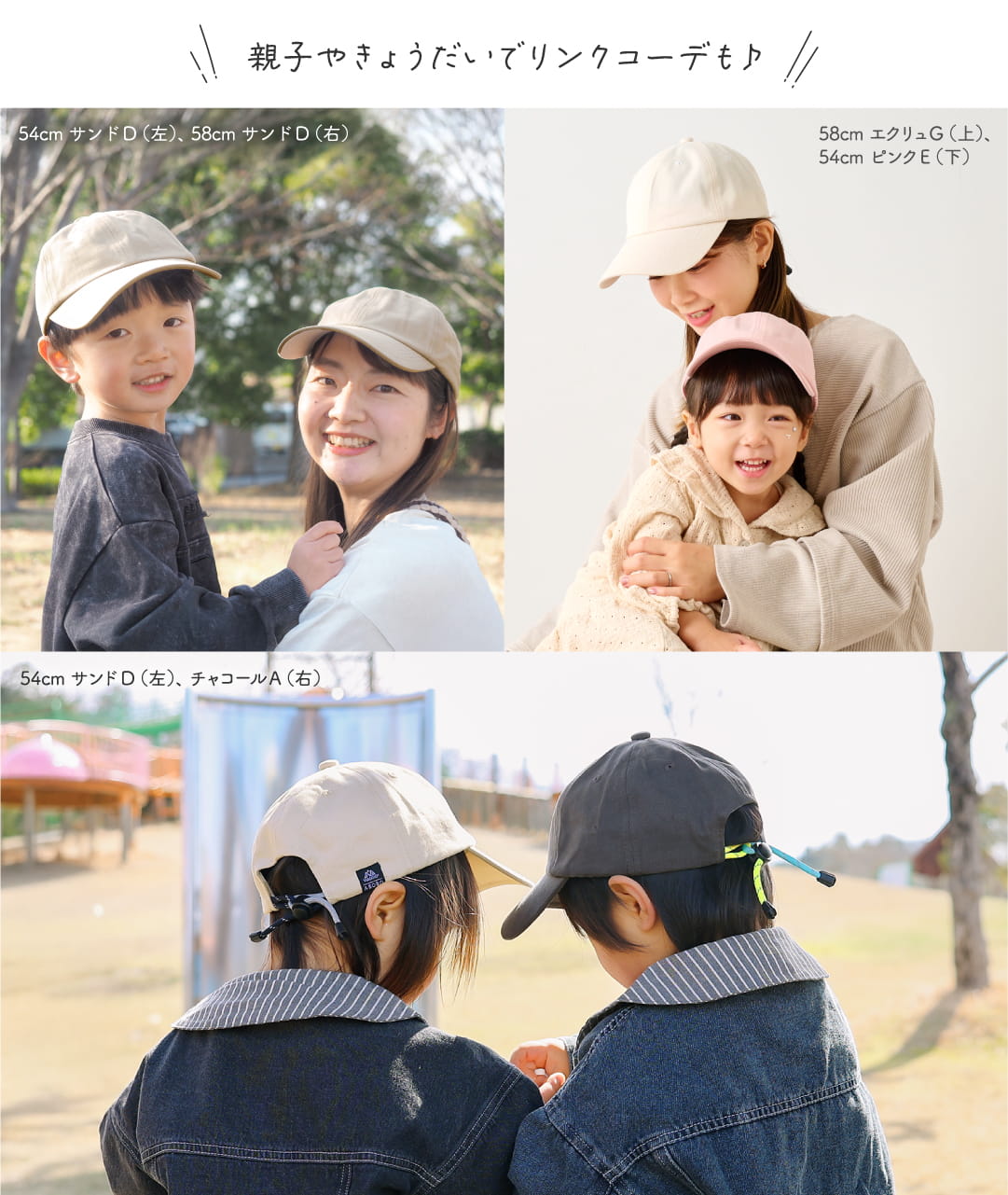 紫外線をしっかりガードしてくれるので、かぶるだけでUV対策ができます。親子・きょうだいでリンクコーデが楽しめる2サイズをご用意しました。