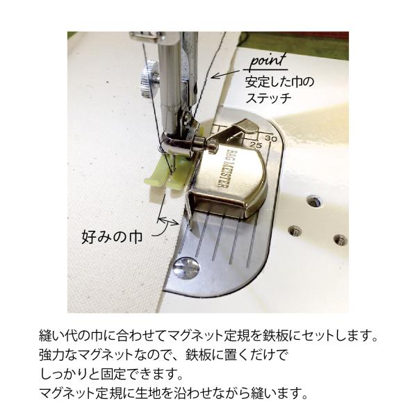 ミシンの鉄板に付けることで、生地を定規に沿わせながら安定した巾で縫うことができます。