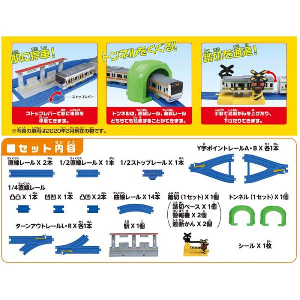 直線レール(2)、曲線レール(14)、1/2直線レール(1)、1/2ストップレール(1)、1/4直線レール(凸凹)(2)、1/4直線レール(凸凸)(1)、1/4直線レール(凹凹)(1)、ターンアウトレール(L・R)各(1)、Y字ポイントレール(A・B)各(1)、踏切ベース(1)、警報機(2)、遮断かん(2)、駅(1)、トンネル(2パーツ)(1)、シール(1)