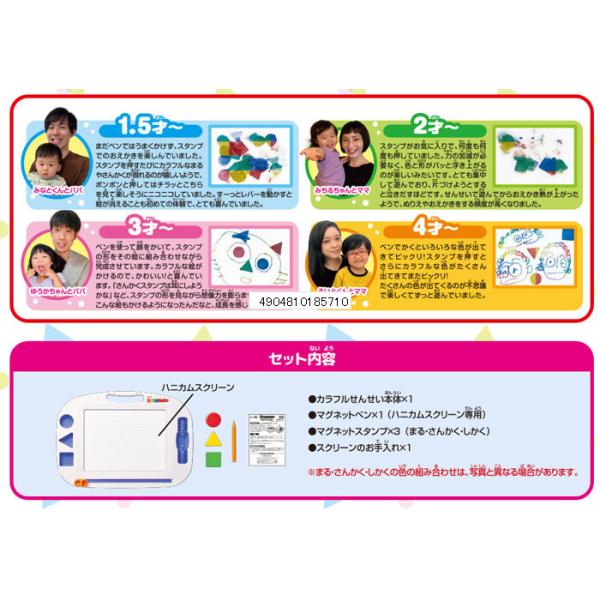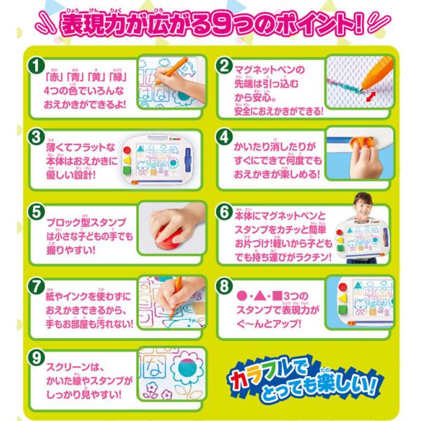 お子様がペンを握れるようになるころに始まる「なぐりがき」から、「もじのれんしゅう」までお子さまの「かきたい」気持ちにこたえる、成長に合わせ長く遊んでいただける安全で楽しいおえかき玩具です。